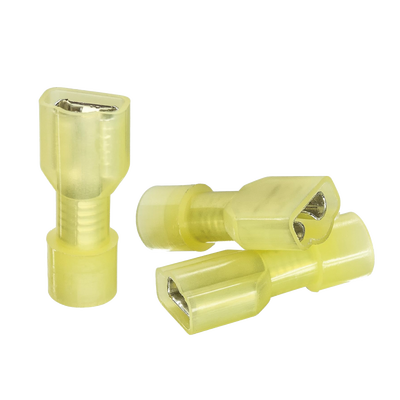 Terminal hembra aislada para seguridad eléctrica. Compatible con cables de 12-10 AWG. Venta en paquetes de 25 unidades. Conexión rápida y segura. Diseño duradero y resistente.