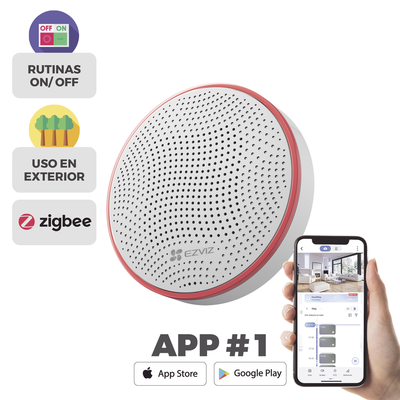 Conexión ZigBee al hub CS-A3. Compatible con kit de alarmas CS-B1. Sonido de alarma ajustable entre 90-105 dB. Operación en temperaturas de -30°C a +60°C. Alimentación de 12 VCC con cable incluido.