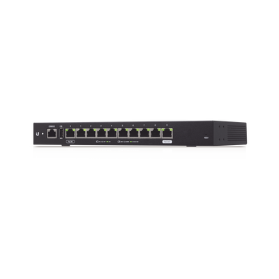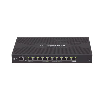 El EdgeRouter ™ 10X ofrece un valor de precio / rendimiento de próxima generación: hasta 260,000 paquetes por segundo de procesamiento con una tasa de línea de hasta 1 Gbps. Los diez puertos Gigabit Ethernet ofrecen conectividad de cobre con entrada PoE en el puerto 1 y paso PoE en el puerto10. El EdgeRouter 10X admite la conmutación de capa 2.