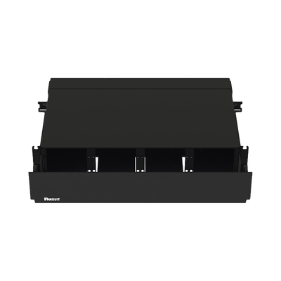 El gabinete para montaje en rack Opticom® de Panduit® garantiza la confiabilidad de la red al alojar, organizar, administrar y proteger hasta 192 terminaciones, empalmes, conectores y cables de conexión de fibra óptica. El FRE2U es de color negro, está hecho de acero y cuenta con 8 ranuras para casetes/FAP. Puede alojar 8 paneles adaptadores FAP, 8 casetes Opticom, 16 casetes HD Flex o módulos de empalme FOSM en un espacio de 2 RU. Se puede acceder fácilmente a las fibras a través de cajones extraíbles delanteros y traseros.