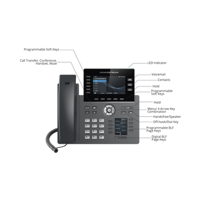 El GRP2616 es un sofisticado teléfono IP de grado de operador diseñado con aprovisionamiento automático para implementación masiva y fácil manejo. Admite 6 líneas y 6 cuentas SIP mientras que ofrece un diseño elegante y un conjunto de características de última generación incluyendo wifi integrado, soporte de Bluetooth, 48 teclas virtuales multiuso (MPKs), dos puertos Gigabit y más: