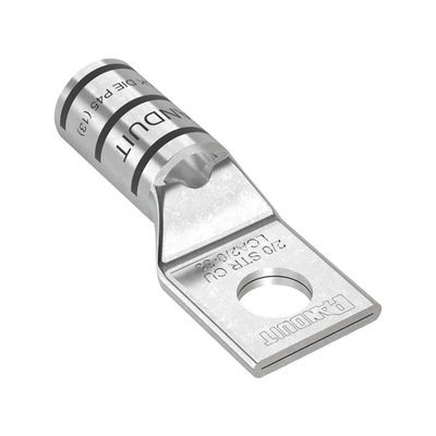 Terminal de compresión para cable 2/0 AWG. Orificio de 3/8' para fácil conexión. Tamaño estándar con tambor codificado por color. Estañado para prevenir corrosión eficiente. Certificación UL y CSA para 35 kV, 90°C.
