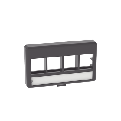 La placa frontal para muebles modulares Keystone acepta cuatro módulos Mini-Com. Se instala a una apertura de muebles de oficina estándar. Incluye un protector para etiquetas para una fácil identificación.