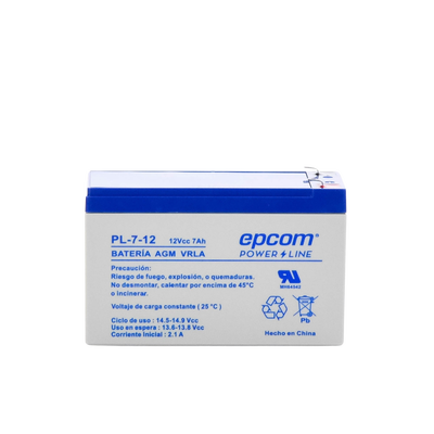 La serie de baterías EPCOM POWERLINE, están diseñadas con tecnología AGM-VRLA ( Fibra de vidrio absorbente, con válvulas de regulación), placas de alto rendimiento y electrólito para proporcionar una salida de energía adicional. Las baterías de la serie EPCOM POWERLINE son baterías de respaldo para equipos electrónicos, con una vida útil de diseño flotante de 5 años a 25°C. , aprobado por UL ( MH64542 ).