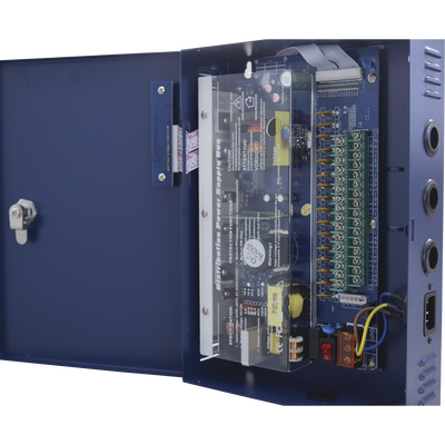 Fuente de poder profesional de 12-14.8 Vcc @ 16 Amper ; para 16 cámaras , Voltaje de entrada : 96-264 Vca, con capacidad de batería de respaldo, requiere batería.