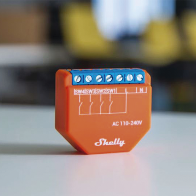 Conectividad WiFi 2.4 GHz sin necesidad de hub. Alimentación AC de 110-240V, 50/60 Hz. Operación a temperaturas entre -20°C y +40°C. Dimensiones compactas de 42x38x17 mm. Controlador de cuatro interruptores en un dispositivo.