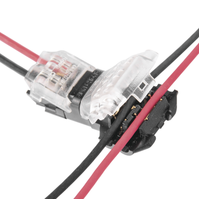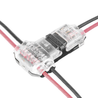 Conector T para conexión 2 contactos. Extracción de señal sin cortar cables. Soporta cables de 0.35 a 0.75mm². Máximo diámetro de cable 2.1mm. Color transparente con negro para visibilidad.