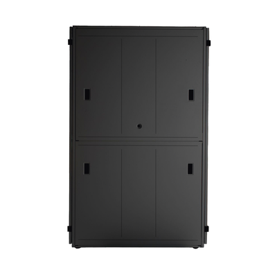 Estructura de acero soldado de alta resistencia. Anchos de 600 mm y 800 mm disponibles. Capacidad de carga estática hasta 1588 kg. Puerta trasera perforada con apertura del 80%. Cumple estándares EIA-310-E y TIA/EIA.