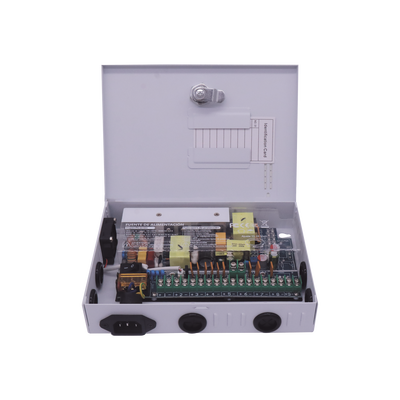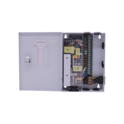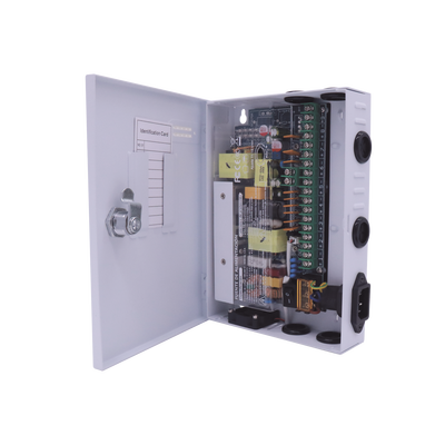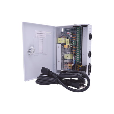 Fuente 9 canales, 16 A para seguridad y comunicación. Voltaje de salida ajustable 11-15 VCC. Corriente máxima por canal: 1.8 A. Potencia de salida total 200 W. Rango de operación: -20°C a 70°C.